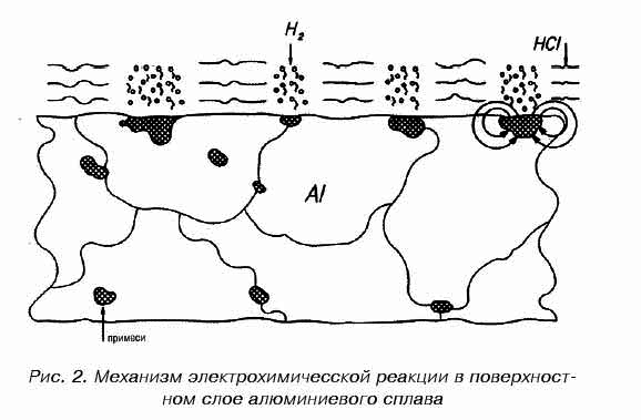 Благодаря наличию таких вкраплений сплав, погруженный в электролит, представляет собой совокупность большого количества микроскопических гальванических очагов. В результате электрохимической реакции, возникающей в этих очагах, металл, выступающий в роли анода (а в нашем случае это основной компонент сплава, алюминий), растворяется, в то время как на микрокатодах выделяется водород (рис. 2).